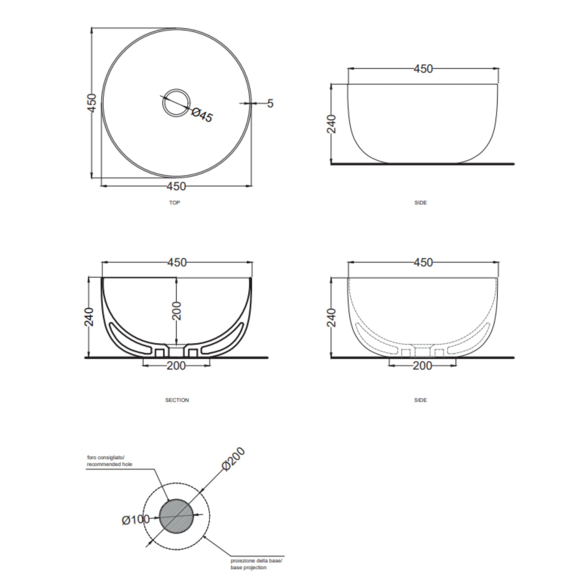 Con diametro 45 cm e altezza 24 cm, è perfetta per installazione da appoggio su top in legno, pietra o altri materiali.