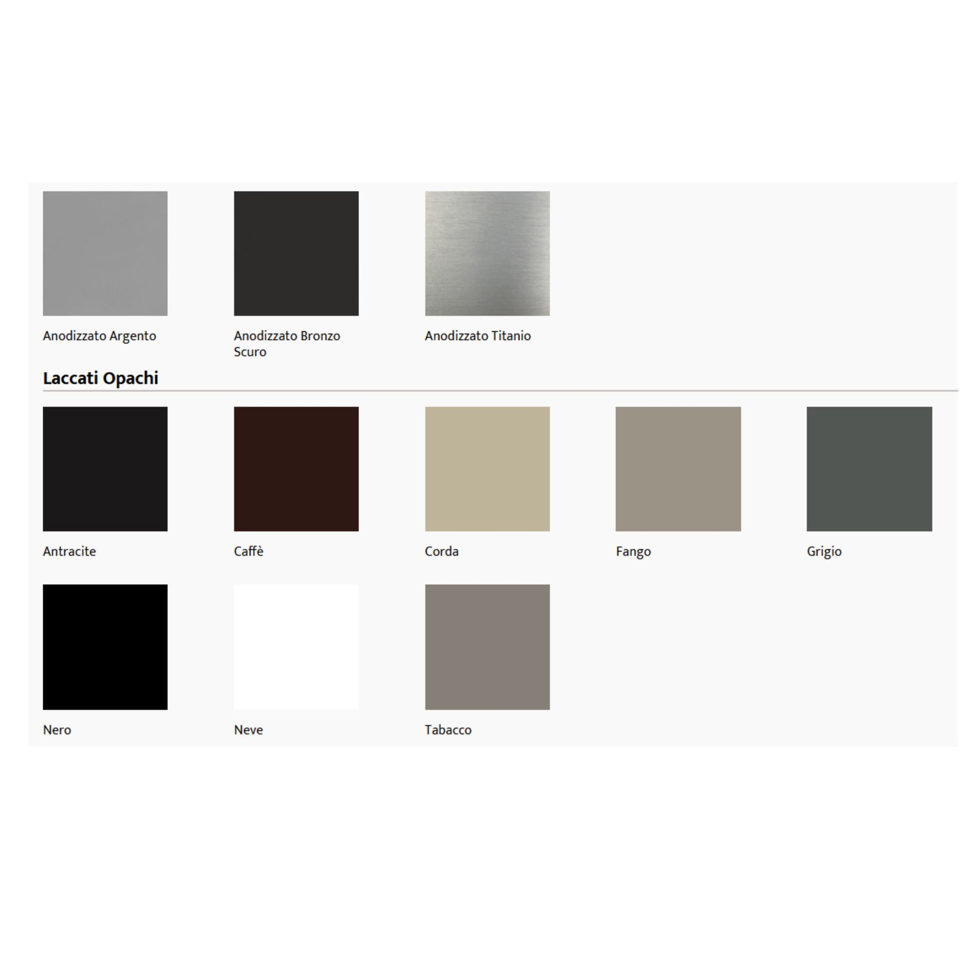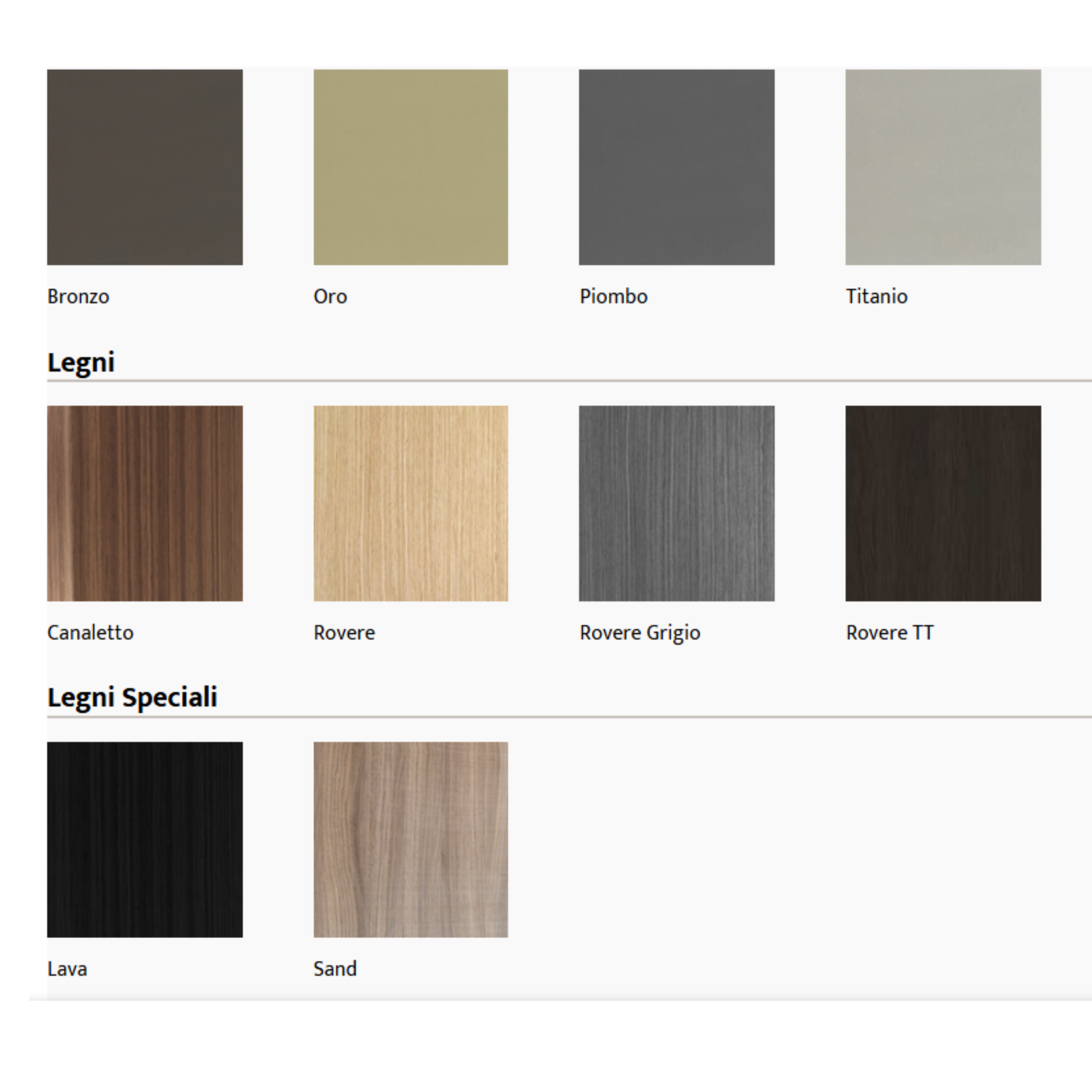 Le finiture disponibili spaziano dai metalli anodizzati (Argento, Bronzo Scuro, Titanio) ai laccati opachi (Antracite, Caffè, Corda, Fango, Grigio, Nero, Neve, Tabacco) e speciali (Bronzo, Oro, Piombo, Titanio), oltre a legni pregiati come Canaletto, Rovere, Rovere Grigio e TT, e legni speciali Lava e Sand.