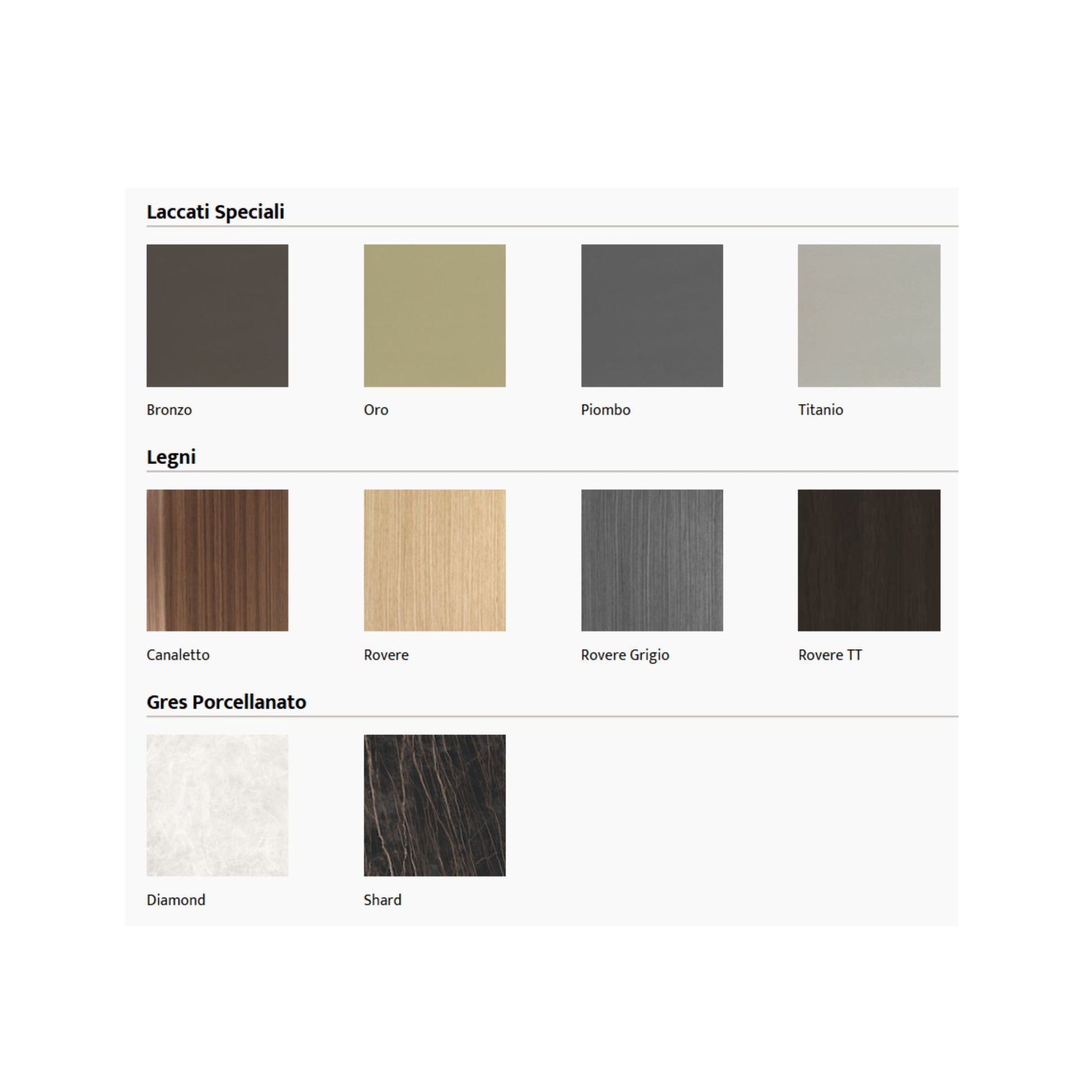 Box sospesi e mensole coordinati arricchiscono le composizioni, mentre l’integrazione totale delle porte permette di nascondere i passaggi e ottenere una superficie unica e omogenea. La boiserie può essere realizzata con un’ampia gamma di materiali e finiture, dal legno naturale al gres porcellanato, dai vetri laccati o acidati fino alle versioni a specchio, offrendo infinite possibilità di personalizzazione.