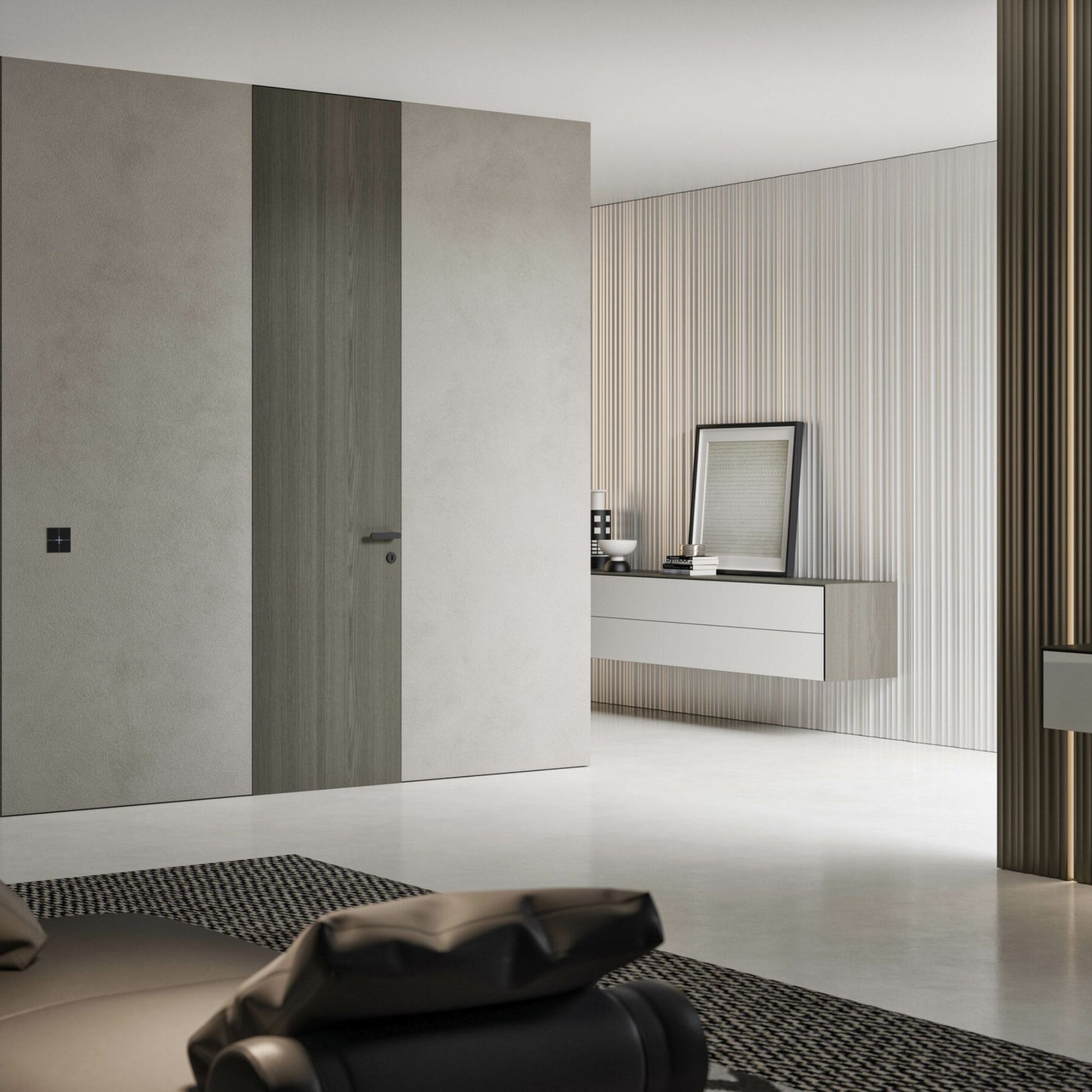 Non è una semplice boiserie, ma un rivestimento architettonico contemporaneo che integra porte battenti complanari e superfici continue, dove l’elemento porta resta nascosto e perfettamente allineato.