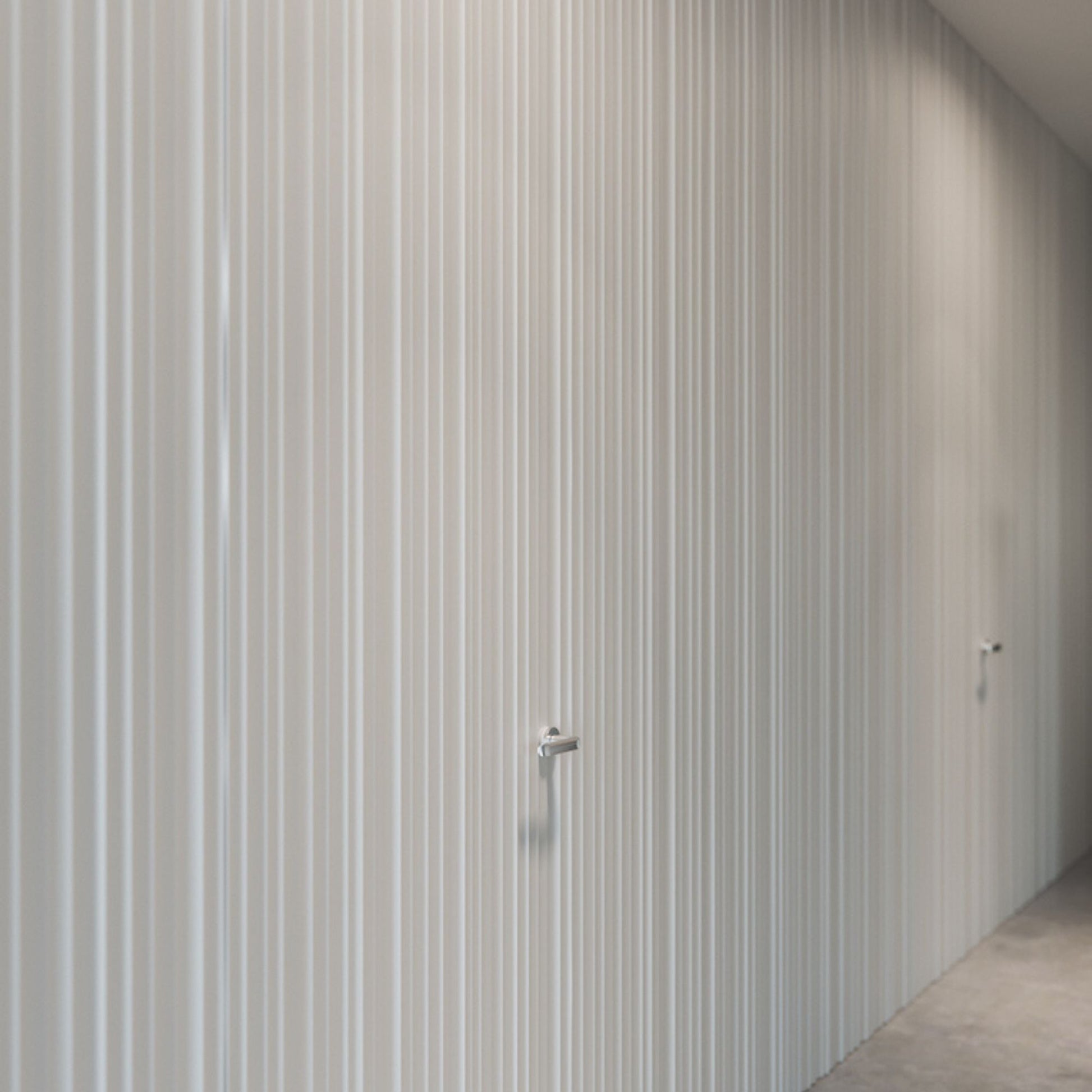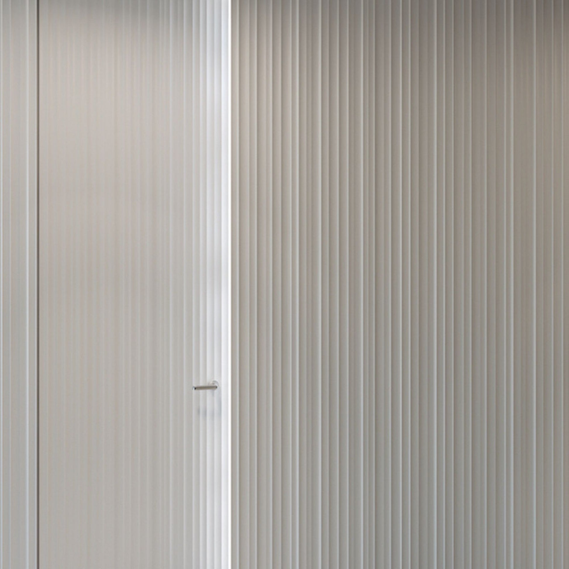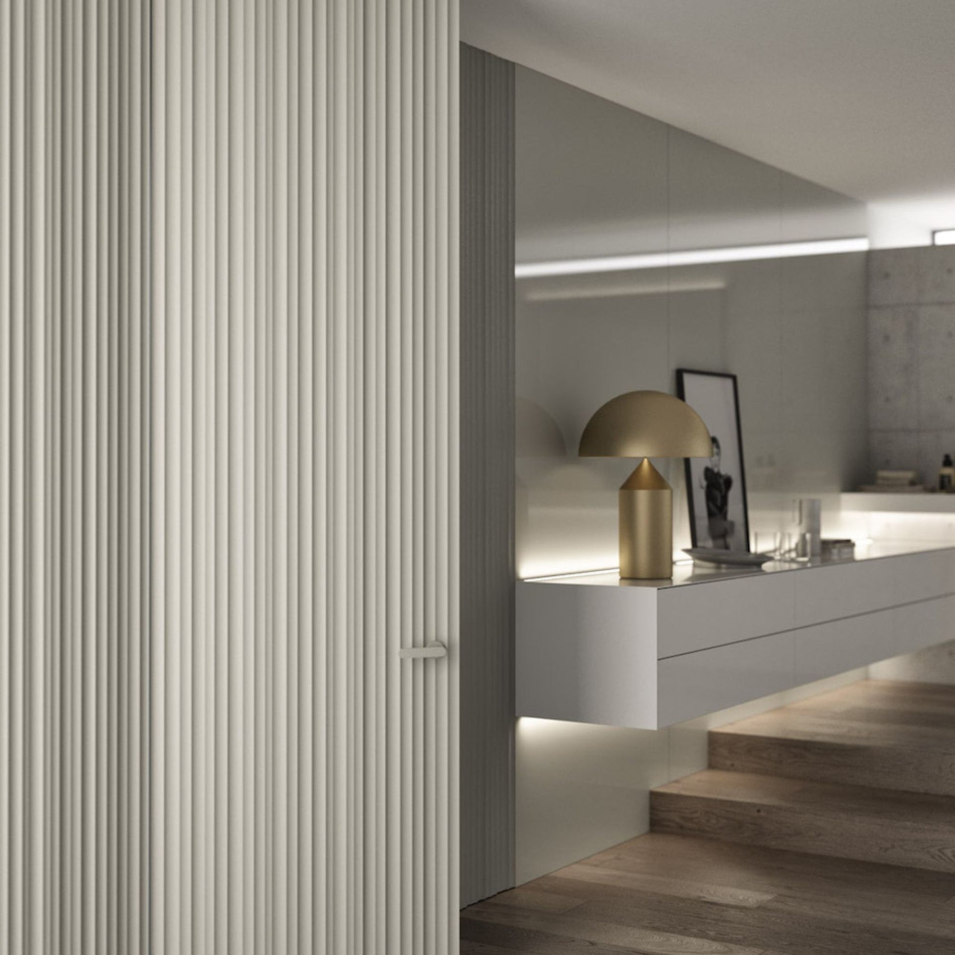Wave si presta a diventare parete divisoria, capace di celare passaggi, corridoi e disimpegni, mantenendo una resa estetica elegante e raffinata. La sua versatilità permette di accostarla ad altre boiserie Res, creando combinazioni di finiture e superfici che si adattano a qualsiasi mood abitativo.