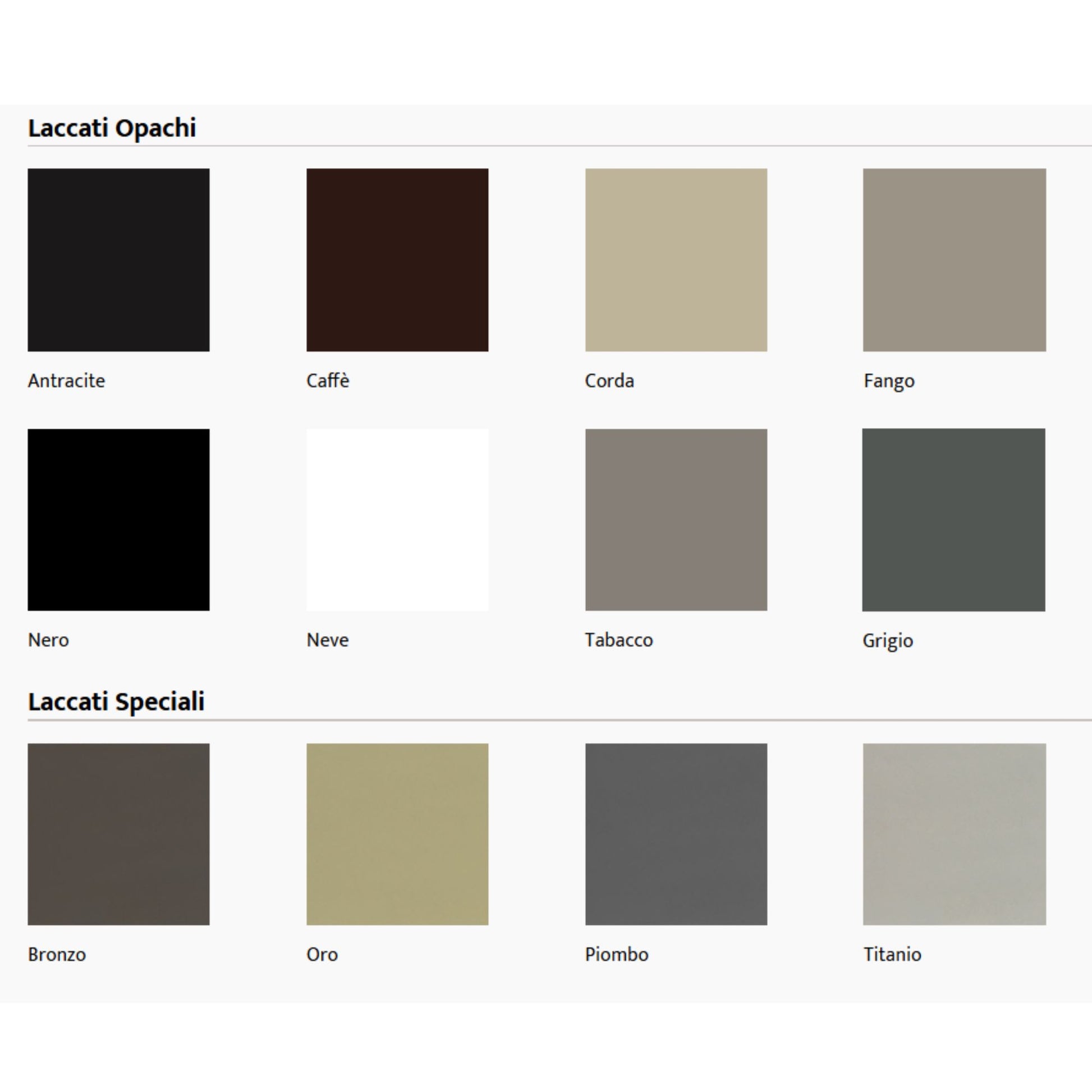 Disponibile in numerose finiture laccate opache (Antracite, Caffè, Corda, Fango, Grigio, Nero, Neve, Tabacco) e laccati speciali (Bronzo, Oro, Piombo, Titanio), questa soluzione è pensata per chi desidera un design distintivo e allo stesso tempo funzionale.