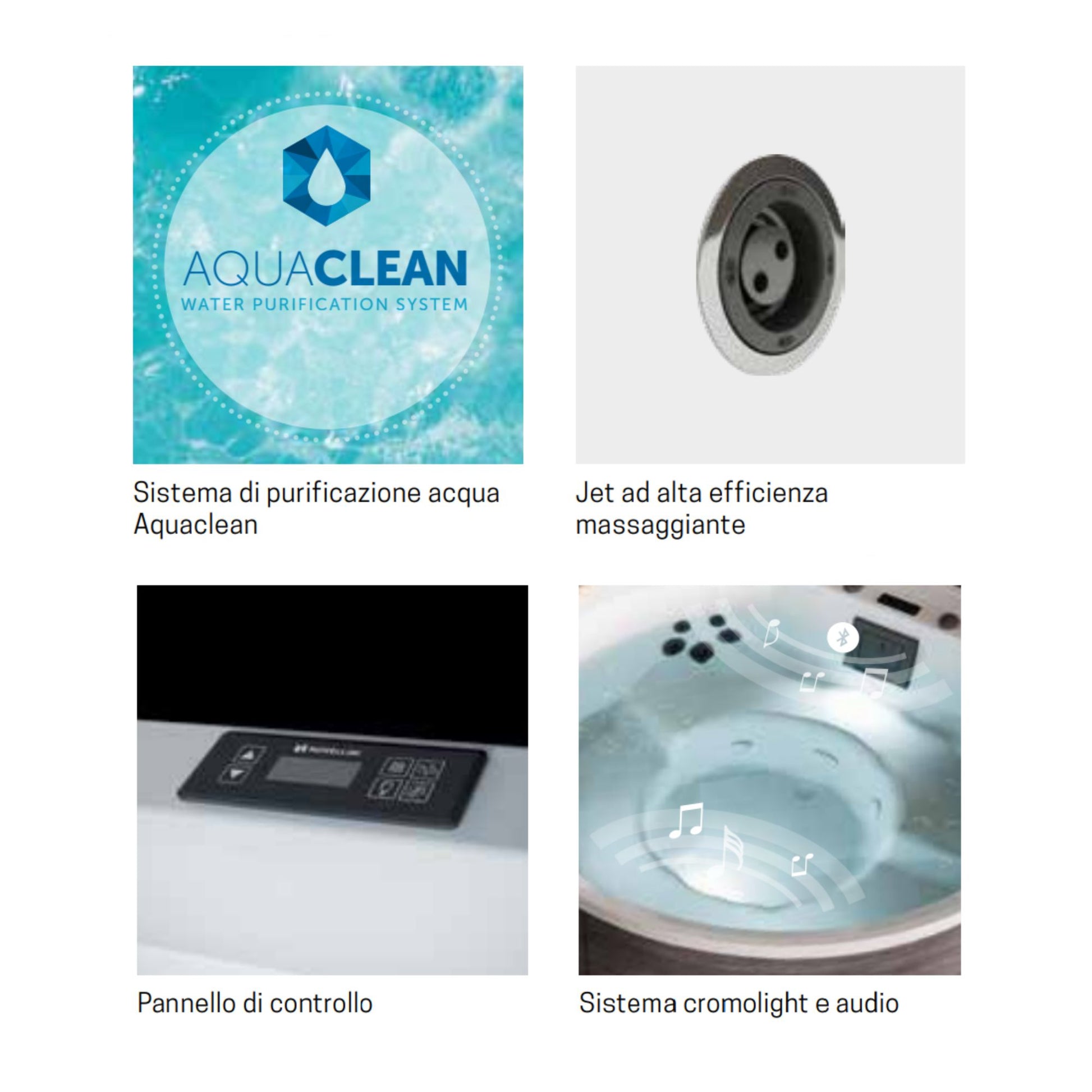Dotata di jet massaggianti ad alta efficienza, sistema di cromoterapia Chromolight, impianto audio integrato con Bluetooth, e avanzato sistema di purificazione Aquaclean (UV + ozono), offre un’esperienza rigenerante e tecnologicamente all’avanguardia.