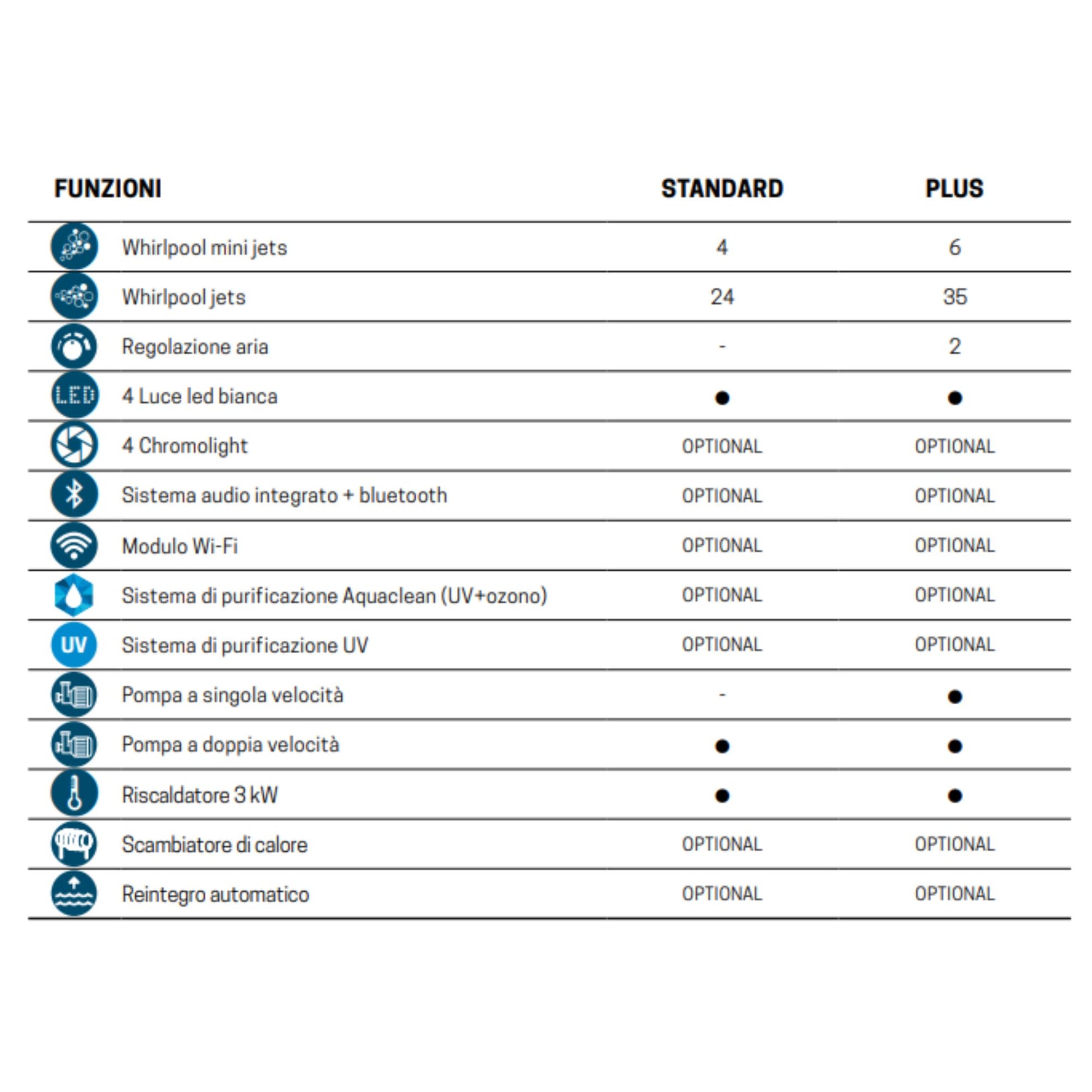 (6 Whirlpool mini jets, 35 Whirlpool jets, 4 luci LED, pompa singola velocità, pompa doppia velocità, regolazione aria, riscaldatore 3 kW)