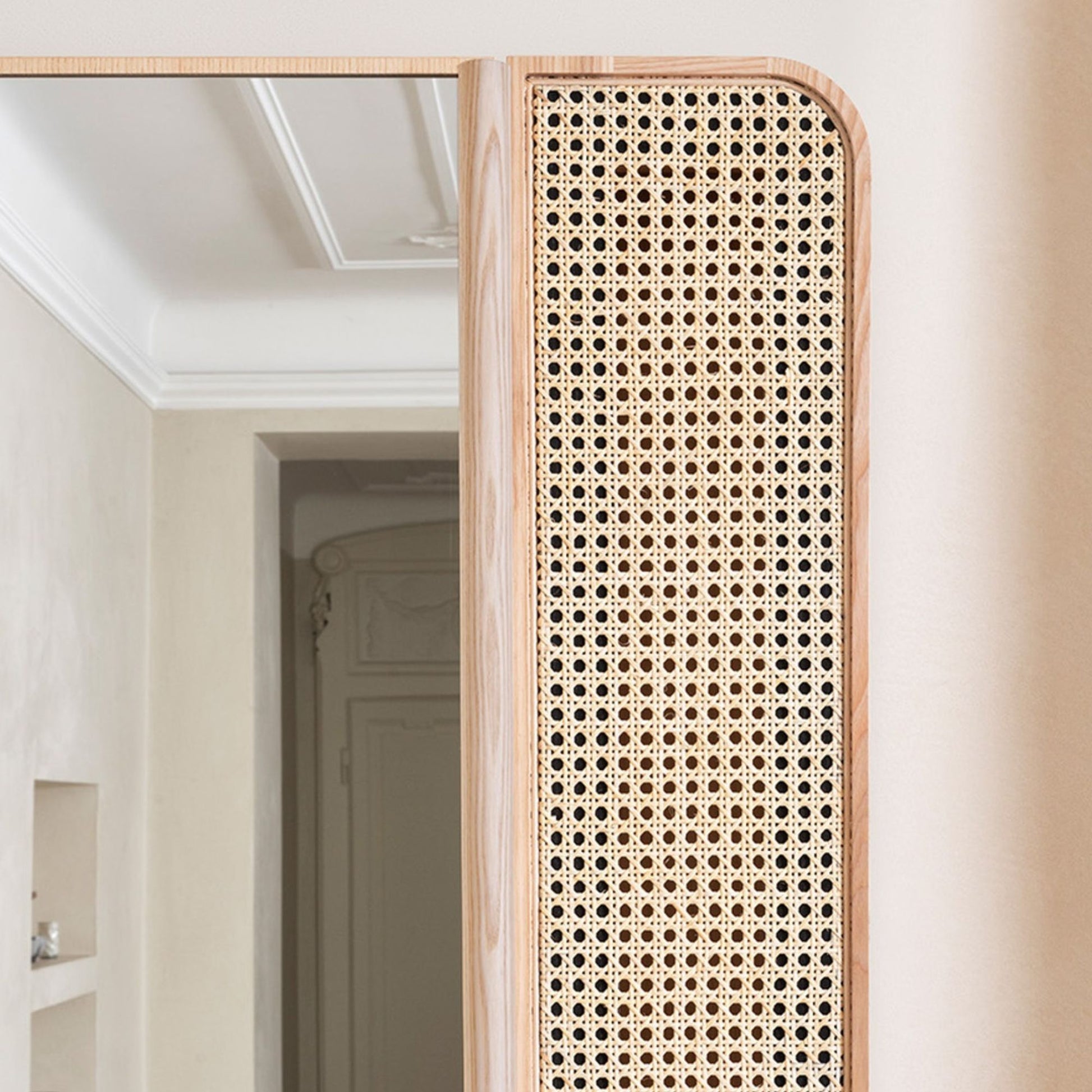 Ciò che distingue lo Specchio Marcel è la sua struttura contenitore rettangolare con doppia anta, unendo estetica e praticità. Realizzato con una pregiata scocca in legno massello di Frassino, disponibile nelle finiture naturali o tinto nero, questo specchio garantisce robustezza e durabilità. La porta frontale destra in autentica paglia di Vienna naturale aggiunge un dettaglio di rara bellezza e un tocco artigianale unico, evocando un'eleganza senza tempo.